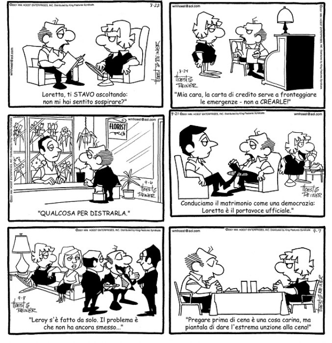 Ogni giorno, milioni di persone non possono fare a meno di rivedersi almeno un pochino in Leroy e Loretta Lockhorn. Le vignette dei Lockhorns, vincitrici di numerosi premi, garbatamente prendono in giro il modo di vita delle coppie sposate, prendendo spunto dalle manie di entrambi i partner per il divertimento di una audience mondiale, su oltre 500 quotidiani. Le loro battute sagaci e pungenti ne hanno fatto un fumetto perennemente apprezzato
