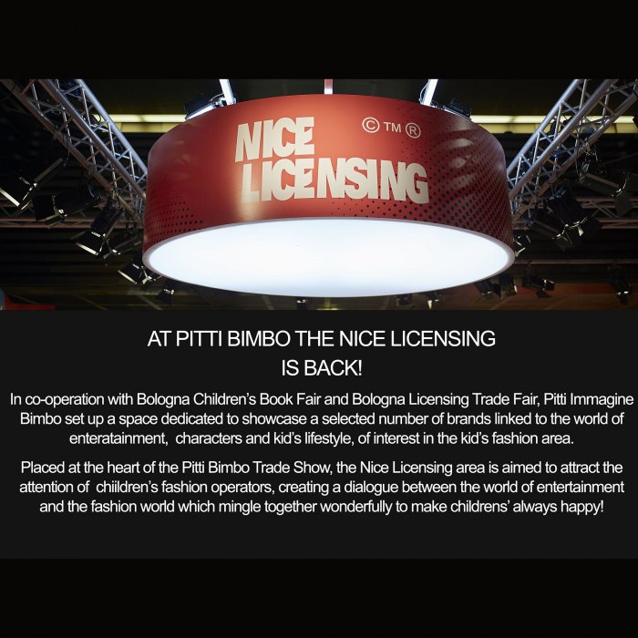In quest'ottica, Pitti Bimbo, in collaborazione con Bologna Licensing Fair, ha creato uno spazio dedicato al mondo del Licensing che con il mondo della moda ha sempre avuto un rapporto molto stretto.