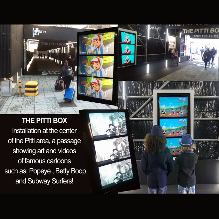 Oltre all'esposizione nello spazio Nice Licensing, cartoons di Popeye, Subway Surfers e Betty Boop sono stati trasmessi per tutta la durata della fiera nell'installazione PITTI BOX situata nel centralissimo cortile della fiera.